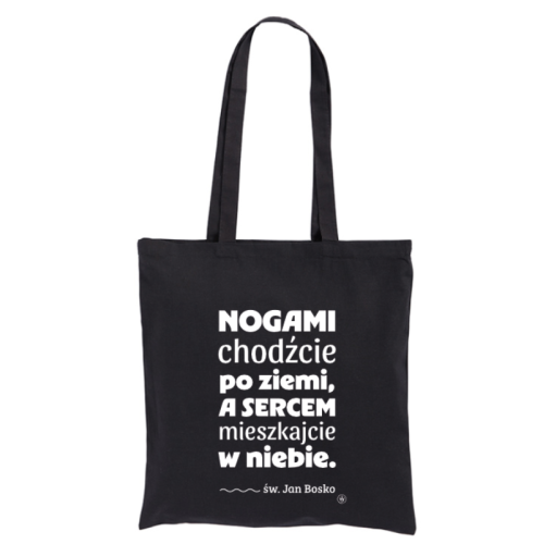 Nogami chodźcie po ziemi, a sercem mieszkajcie w niebie - te często powtarzana słowa św. Jana Bosko przypominamy na czarnej bawełnianej torbie.